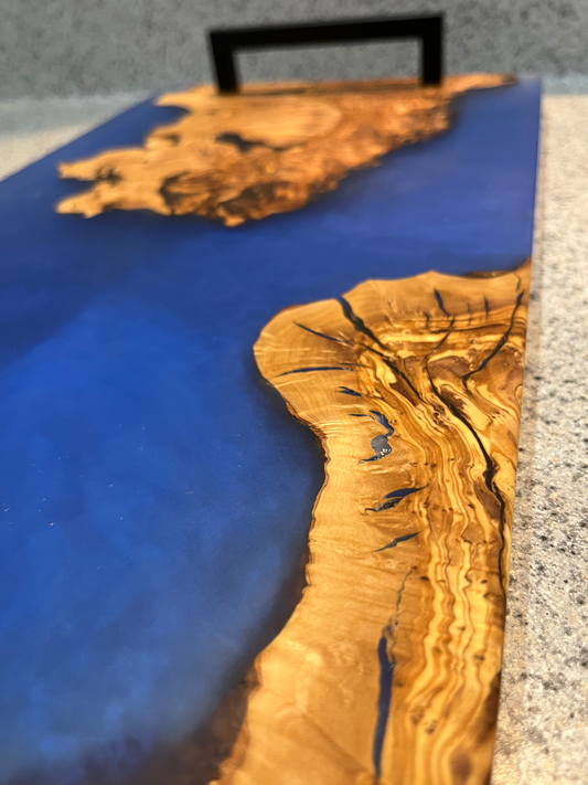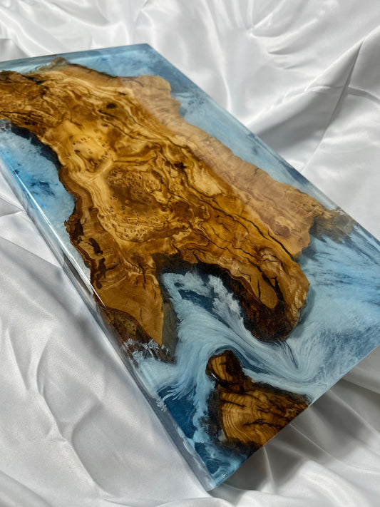 OLIVE WOOD BURL AND OCEAN BLUE EPOXY SERVING TRAY